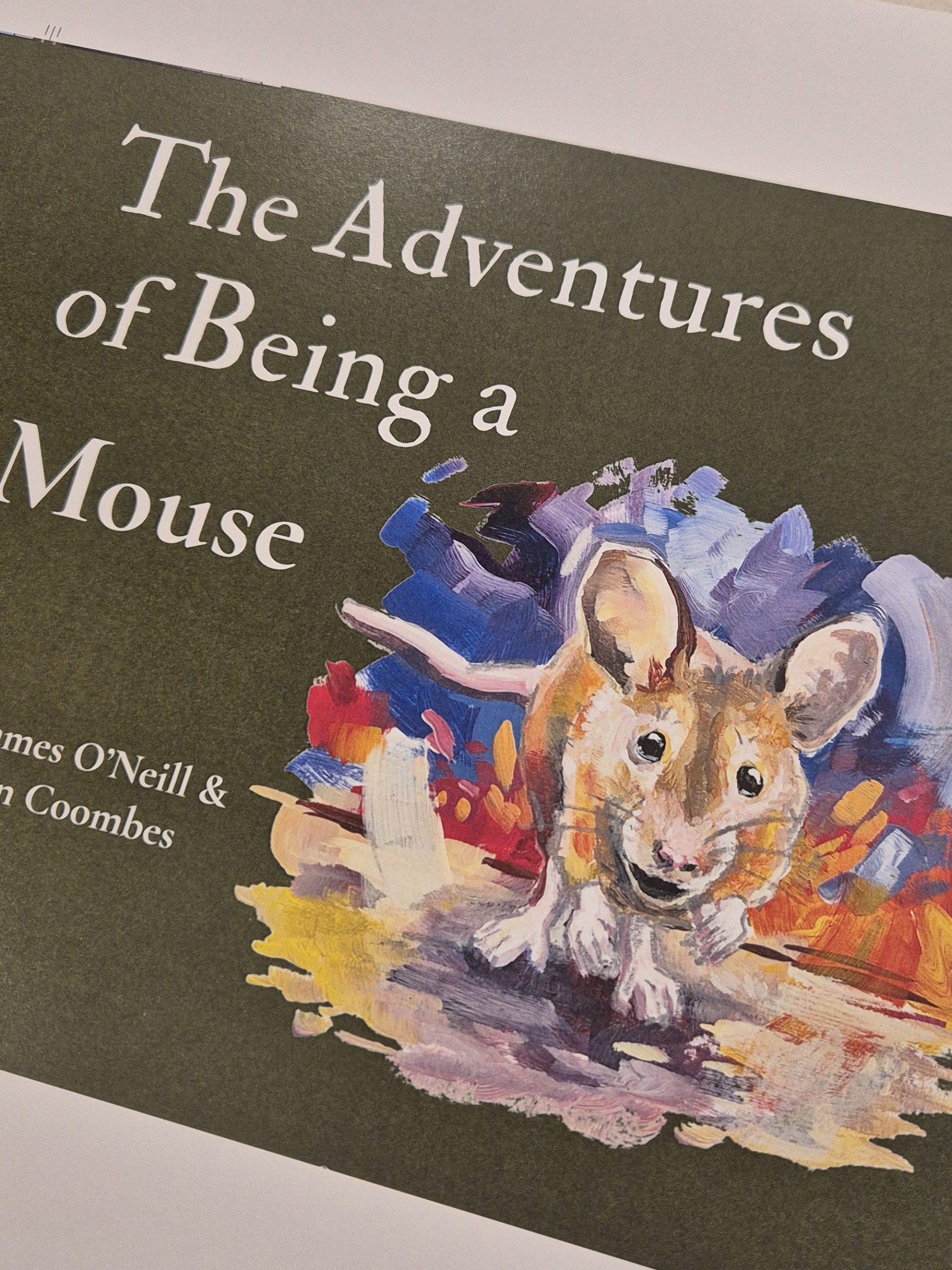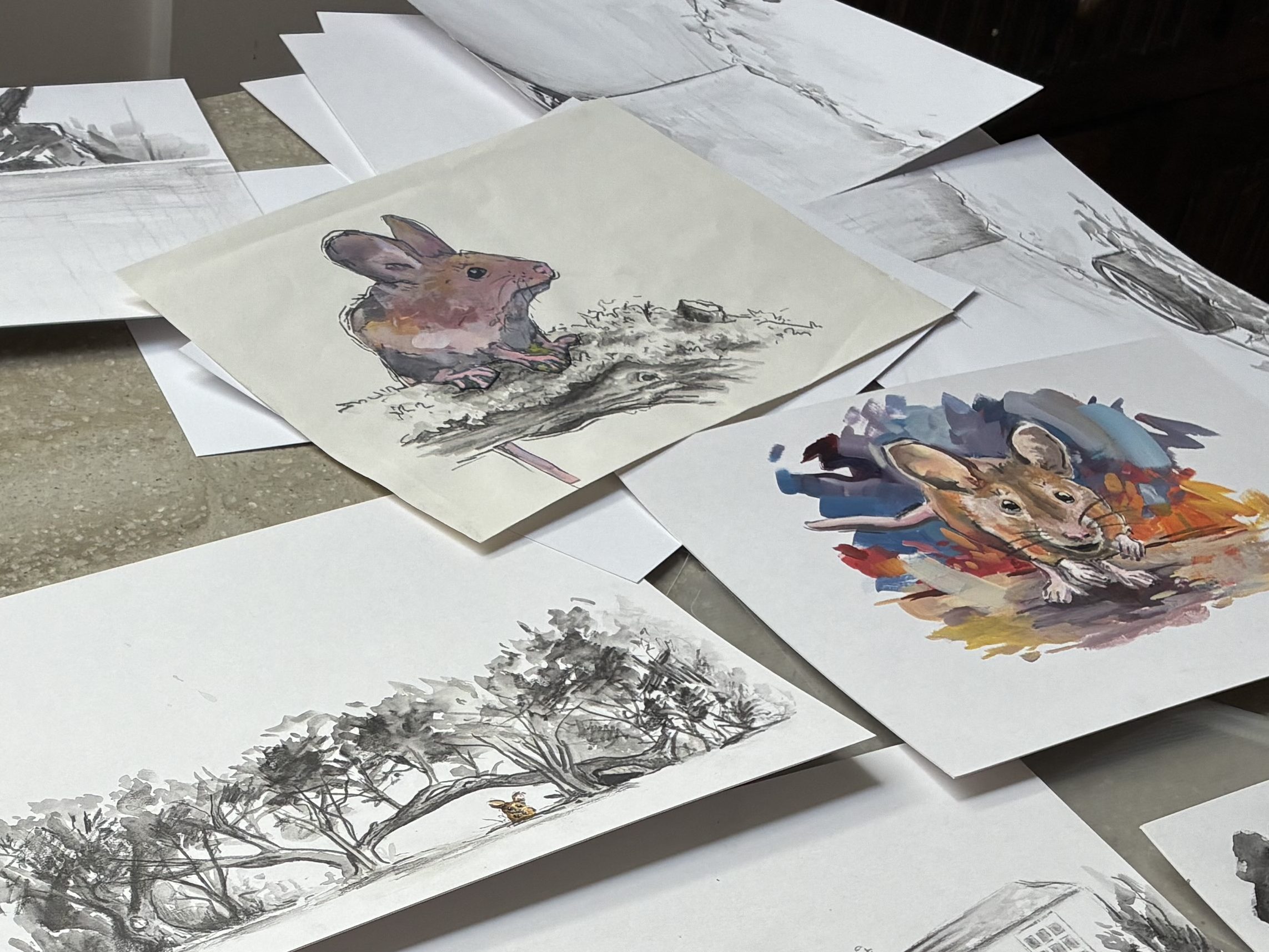 Although predominantly a painter, Dan loves to explore new creative challenges, so when an opportunity to collaborate with James on The Adventures of Being a Mouse arose the challenge was accepted. After exploring a range of possible techniques and styles, Dan settled on black and white  drawings using water soluble graphite sticks with painted areas of colour for the mouse and its interactions. Ensuring Mouse and its world retained its natural form with the vibrant edge of humanity tinging its experiences.